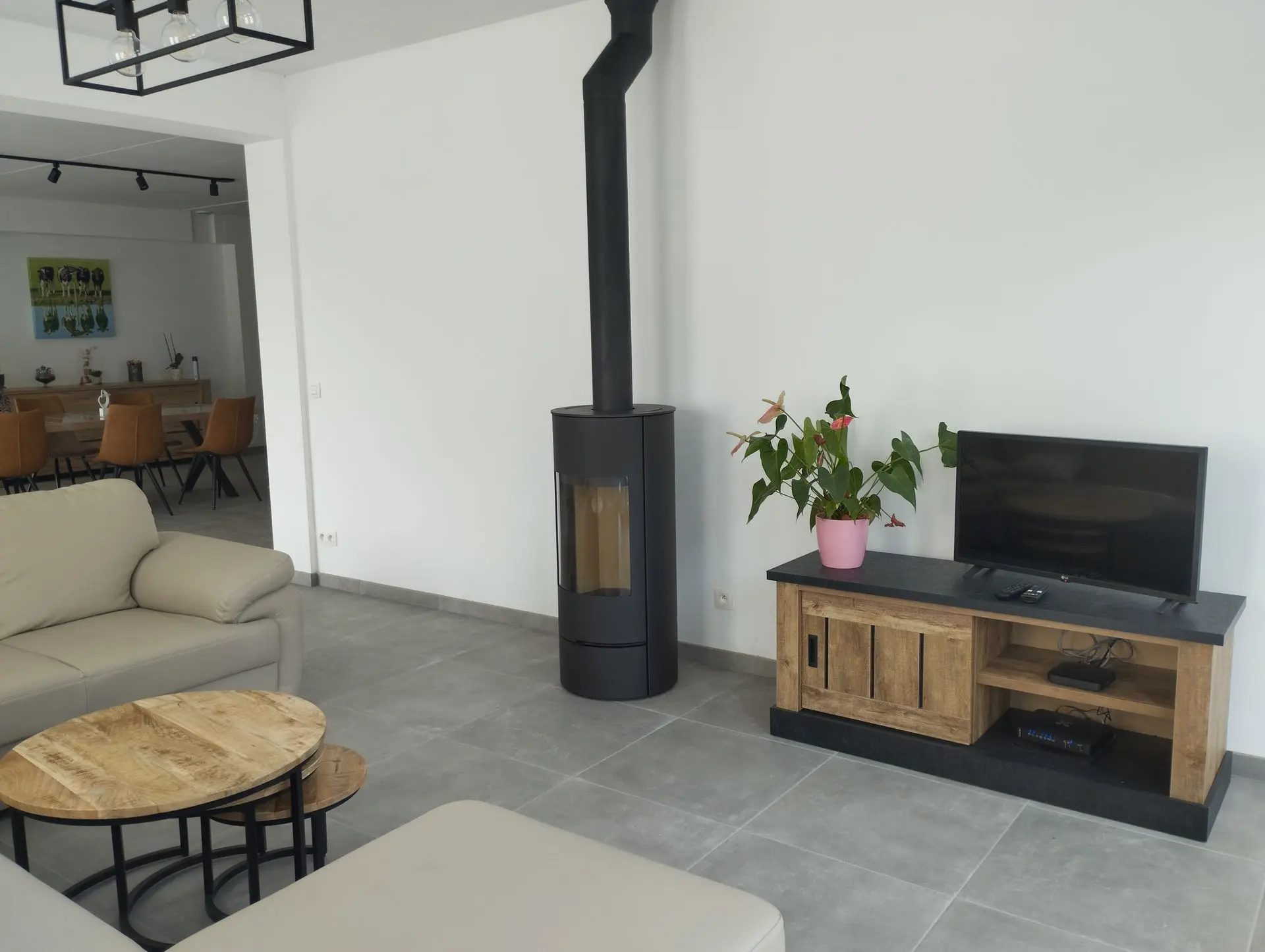 un lave-vaisselle, un micro-ondes, deux fours, deux frigos, deux taques, un grille pain, une cafetière, une bouilloire, deux appareils à raclette/pierrade, un lave-linge, un congélateur, chauffage par le sol, un poêle à bois, une télévision, quelques équipements pour bébé, baby-foot, wifi, salle de jeu/repos.